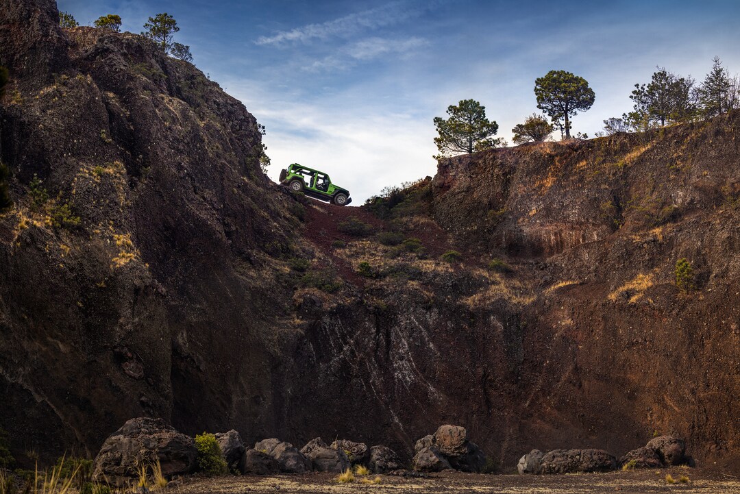 Top options include the Sky One-Touch Power Top, Dual Top Group combining soft and hard tops, and various three-piece hardtop configurations. The manual convertible top with fixed roll-over protection maintains the classic open-air Wrangler experience.
